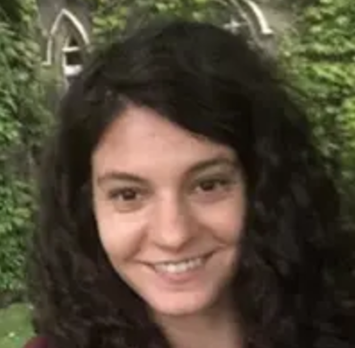 A person with curly hair and glasses smiles against a red brick wall, wearing a flower-patterned sweater. No landmarks are visible.